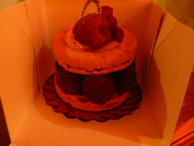 写真うつりが悪いですがマカロンの間にラズベリーがサンドされているケーキ。